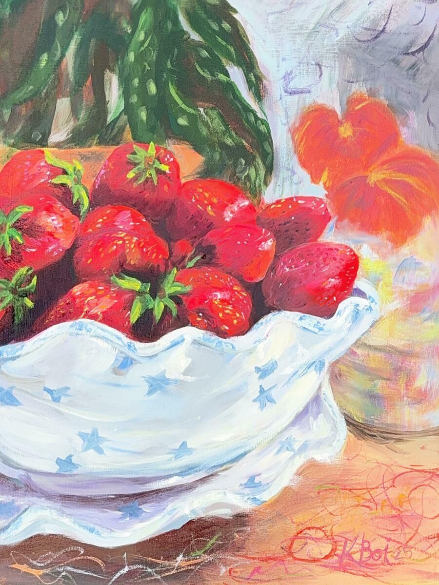 bowl brimming with fresh strawberries, a field dotted...Read more